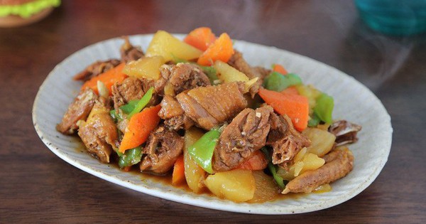 Thịt lợn xào dứa có mùi thơm của tỏi, hành khô và sả, vị ngọt của dứa ngấm mỡ béo ngậy, thịt được ngấm đều với nước sốt đậm đà