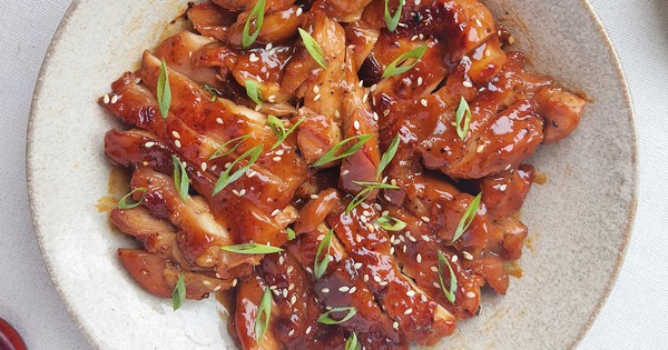 Gà rim xá xíu với thành phẩm là thịt gà chiên vàng giòn bên ngoài, nóng mềm bên trong quyện đều với nước tương được nếm hợp vị, sánh mịn